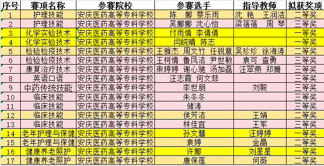 本次大賽我校共派出24組參賽隊,參加化學實驗技術、老年護理與保健、健康養老照護、臨床技能、護理技能、檢驗檢疫技術、康復治療技術、中藥傳統技能、英語口語等12個賽項的角逐,共獲得一、二、三等獎17項,其中一等獎4項,二等獎5項,三等獎8項。此外,我校還積極主動承辦了省級化學實驗技術大賽。