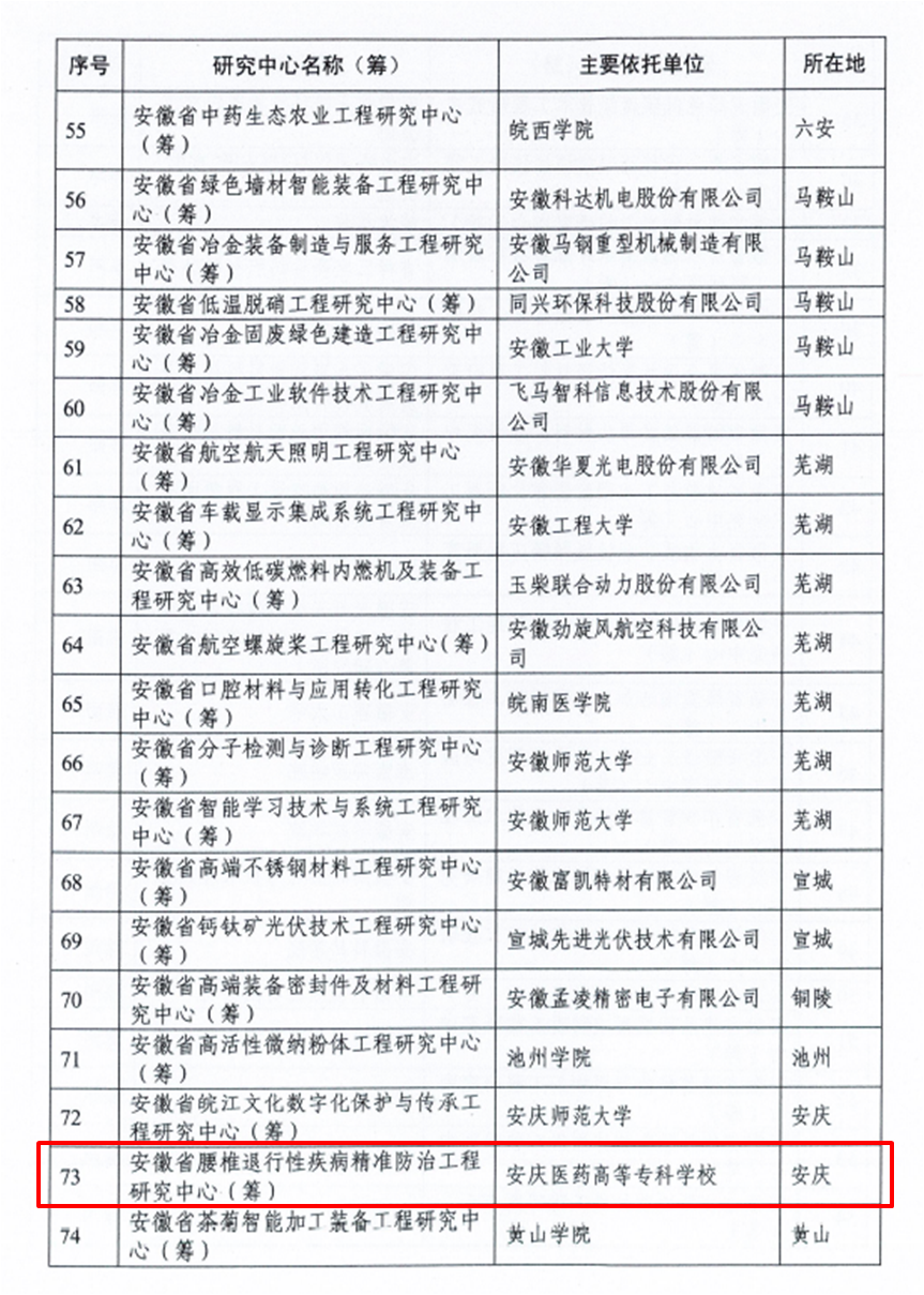 高瞻遠矚施戰略,同心同德共奮進。近日,安徽省發展和改革委員會官網發布了2022年度安徽省工程研究中心評審認定結果名單,我校申報的“安徽省腰椎退行性疾病精準防治研究中心”獲批籌建,標志著學校在省級科創平臺建設方面取得新突破。